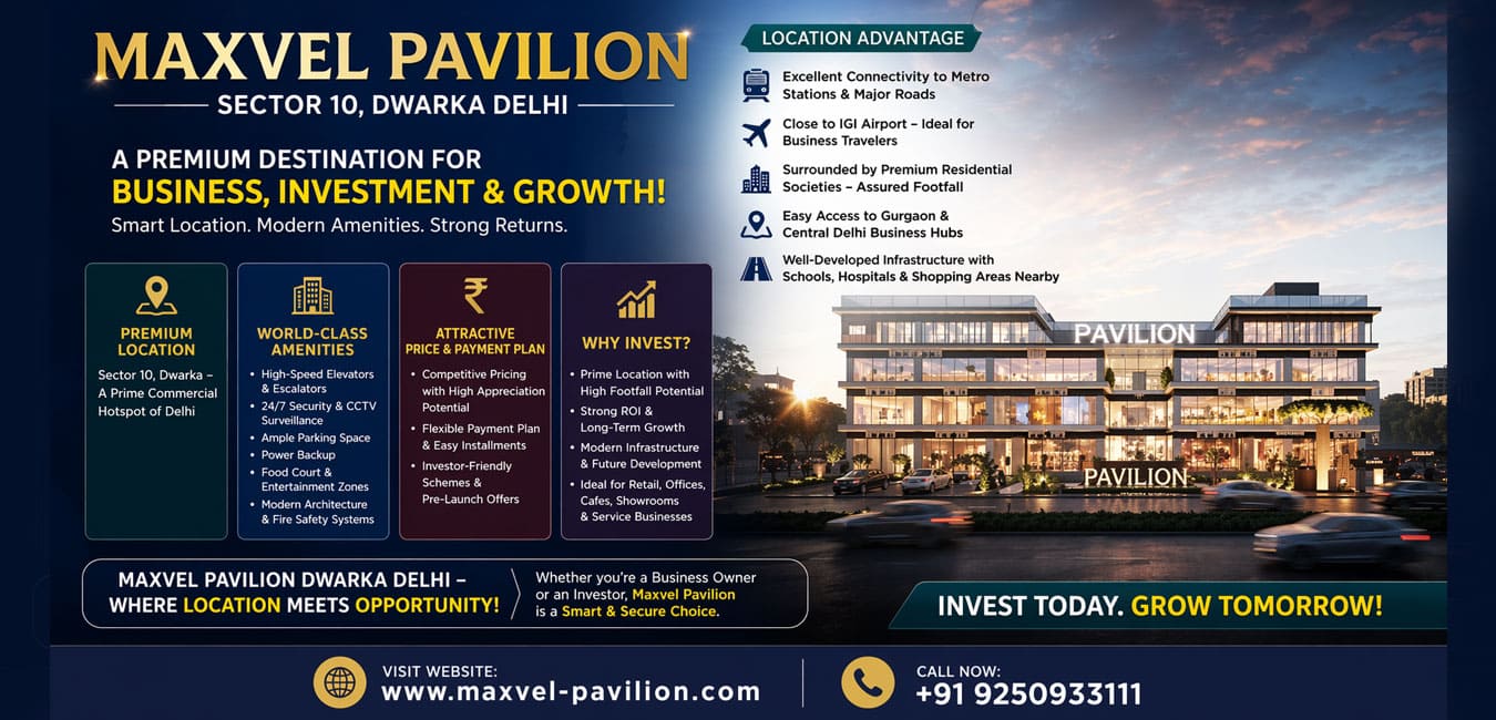 If you are looking for a high-return commercial property in Delhi, Maxvel Pavilion Dwarka Delhi is definitely worth considering. Its combination of location advantage, infrastructure, and future growth potential makes it a smart and secure investment choice.
