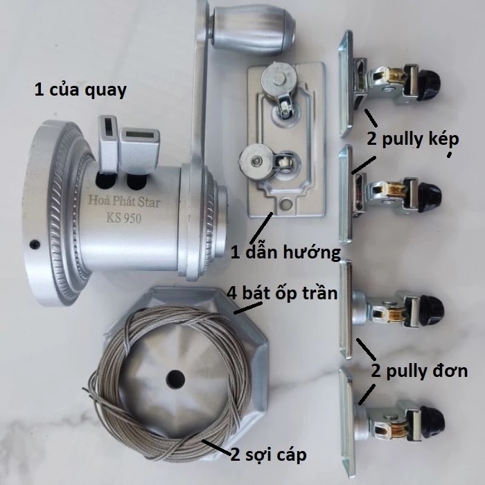 Tay quay: Thiết kế, vật liệu, độ nặng, cơ chế hoạt động (ví dụ: có hãm tự động, êm ái). Tay quay KS950 chính hãng thường được chế tạo từ hợp kim nhôm đúc liền khối, mang lại cảm giác cầm nắm vững chắc và trọng lượng phù hợp. Cơ chế hãm tự động hoạt động êm ái, không gây tiếng ồn lớn và dễ dàng điều chỉnh độ cao của thanh phơi. Lớp phủ bề mặt của tay quay, thường là sơn tĩnh điện hoặc anode hóa, giúp nó bền màu và chống trầy xước tối ưu.
